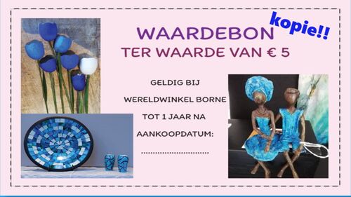 Wereldwinkel Borne verkoopt eigen cadeaubonnen (zie afbeeldingen hieronder) die alleen in onze winkel als betaalmiddel geaccepteerd worden. Altijd leuk om iemand mee te verrassen die vervolgens iets van zijn/haar gading kan uitzoeken in onze winkel. U kunt in onze winkel ook betalen met de VVV-kaart!!